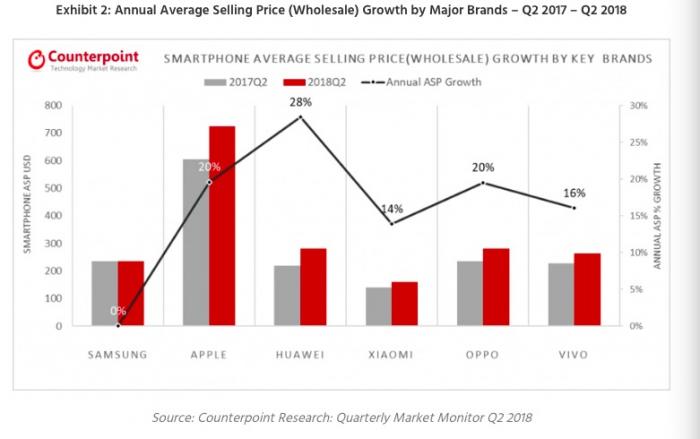 不过国产手机的单台手机的均价(ASP)正在上升,Counterpoint Research数据显示,2018年第二季度华为单台手机均价同比上涨28%,OPPO上涨20%,vivo和小米分别上涨16%和14%,但与苹果700多美金的单价相比还是有两倍多的差距。