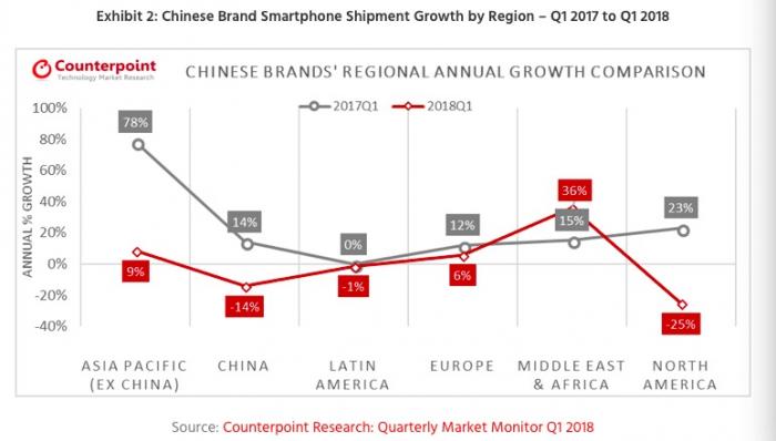 可以从Counterpoint Research2018年第一季度的数据看到中国品牌的全球化足迹。相比2017年第一季度,2018年第一季度中,中国品牌在东南亚、欧洲、中东非地区等地区有不小增长,尤其是中东非地区。与此对应的是,二季度中主打非洲市场的传音手机首次成为全球销量第十名的手机。而北美市场和拉丁美洲都有不同程度的跌落。