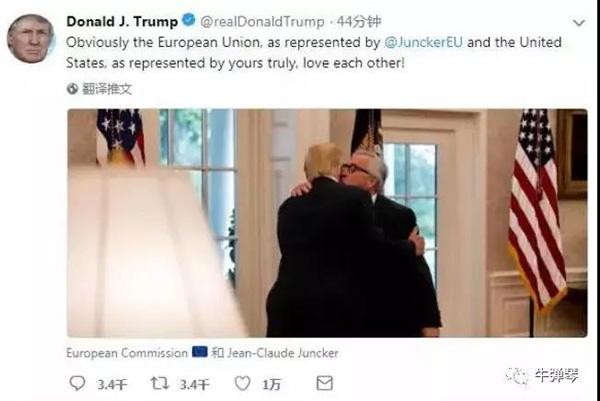 如果是这样的态度,谈判很可能破裂,来谈判的欧盟委员会容克有点忐忑不安,但出乎他意料的是,特朗普一见面就主动拥抱了他,并且还发推特说:“显而易见,容克所代表的欧盟及你们代表的美国,真的爱对方!”他还贴了一张与容克“贴面礼”的照片。