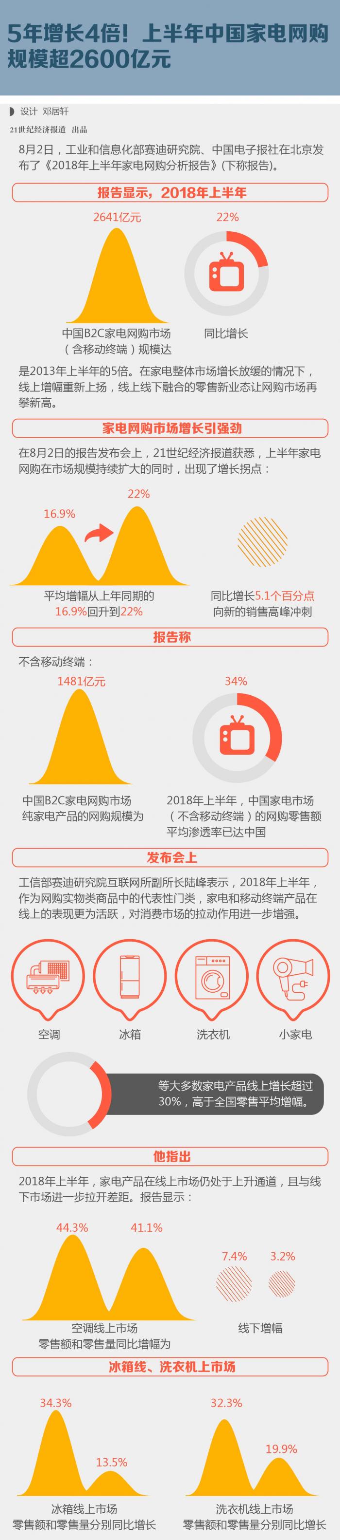 8月2日,工业和信息化部赛迪研究院、中国电子报社在北京发布了《2018年上半年家电网购分析报告》(下称报告)。报告显示,2018年上半年,中国B2C家电网购市场(含移动终端)规模达2641亿元,同比增长22%,是2013年上半年的5倍。在家电整体市场增长放缓的情况下,线上增幅重新上扬,线上线下融合的零售新业态让网购市场再攀新高。