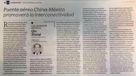 中国驻墨西哥大使邱小琪在墨西哥主流媒体《金融家报》上盛赞海南航空。