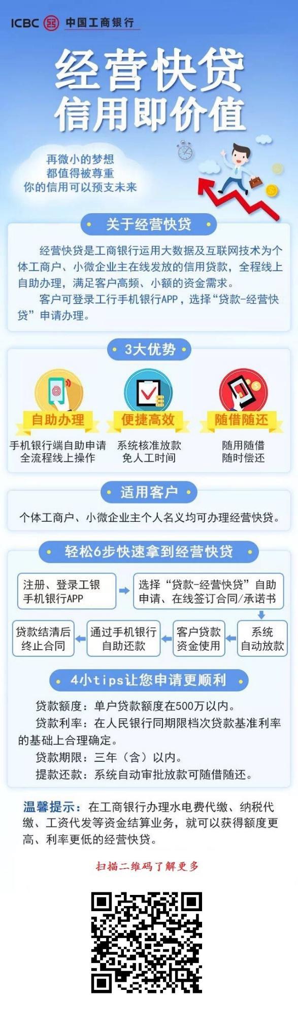 近日,工商银行推出的“经营快贷”产品,让小微企业家们感到十分惊喜。“经营快贷”是工行应用大数据技术手段,创新数字化普惠金融服务的重磅成果。产品以其方便、快捷、智能等诸多优势,推出当天即快速吸引了大批客户,为客户解决融资难题,赢得广泛好评。