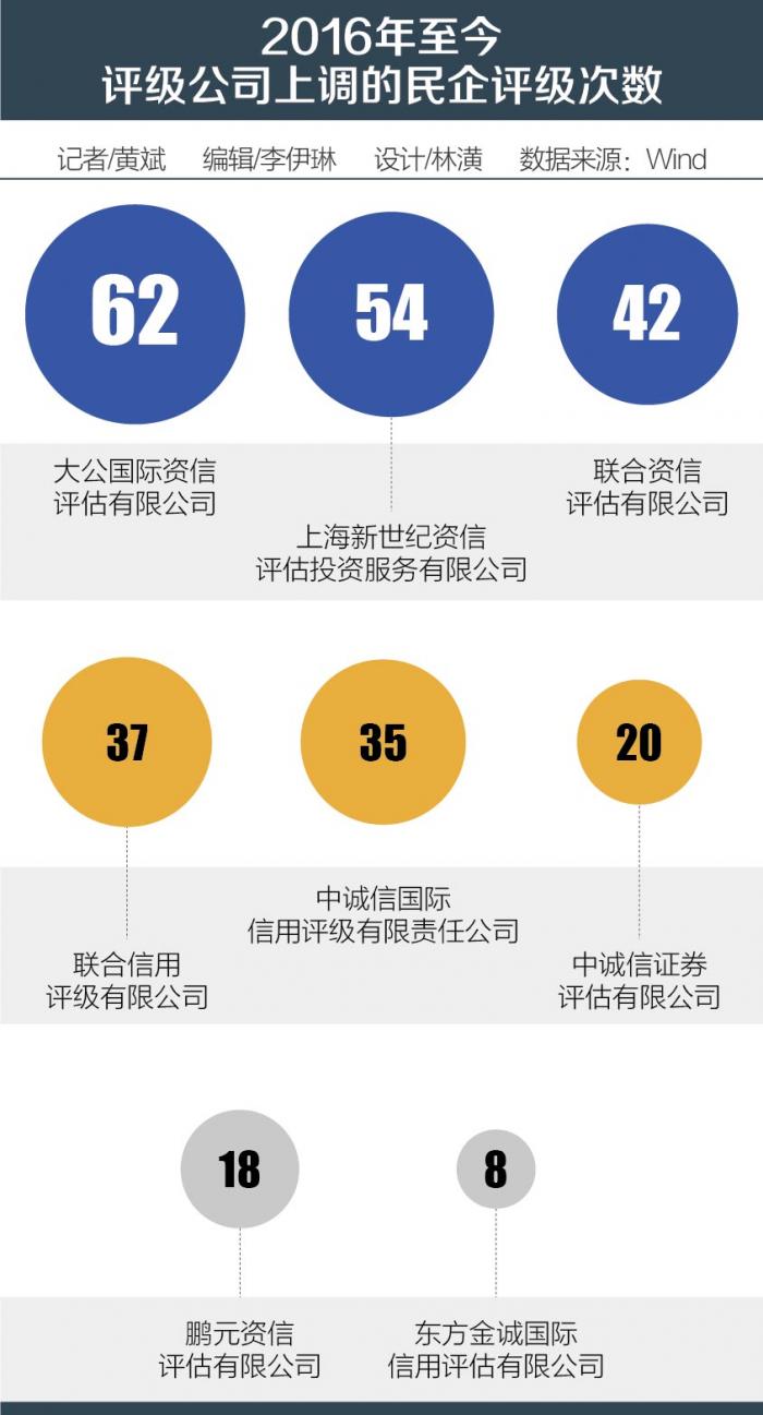 其中,联合(包括联合信用及联合资信)最多,上调数量为79次;大公国际次之,共62次;中诚信(包括中诚信国际及中诚信证评)与上海新世纪不相上下,分别为55次和54次。