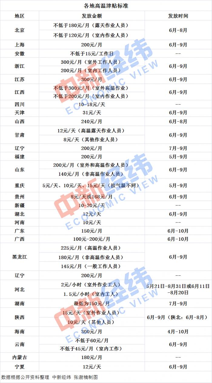 如按月计算,浙江、江西、海南三省高温津贴发放标准最高,室外作业人员每人每月300元;室内作业人员每人每月200元。其中海南无论是室内作业还是室外作业,高温津贴一律为300元/月。