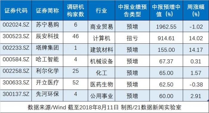 其中苏宁易购业绩预增中值最高,为1962.55%。