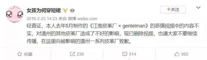 2015年-2016年,改编自上述文案的神曲《江南皮革厂倒闭了》让这个梗二度翻红,却招致众多温州商人的不满,他们向多地主管部门举报这一诋毁行为。后来,歌曲制作人公开道歉,相关商贩也受到行政处罚。