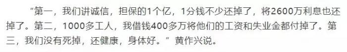据当时中新网报道,黄作兴替侄子黄鹤还掉了部分债务。当时,黄作兴一共拿出了近1.3亿元,偿还了工厂的担保款和工人工资。