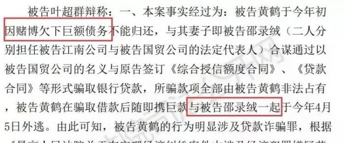 而据每日经济新闻,从浙江法院公开网获得的一份民事判决书显示,在一起涉及深圳发展银行温州分行、温州国信贸易有限公司(法定代表人为邵录绒)和浙江江南皮革有限公司(法定代表人为黄鹤)的金融借款合同纠纷案中,一位名叫叶超群的被告,曾在辩述时称: