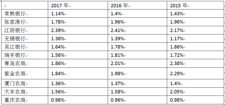 从上表可以看到,大部分农商行不良率呈下降态势。比如说在2017年,除重庆农商行不良率本就处于较低水平外,上述所有农商行的不良率均比上年下降。