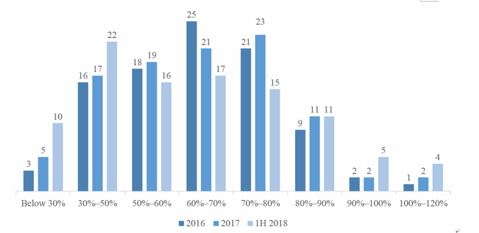 微贷的放款成数在2018年起也呈现收紧趋势。加权平均的放款成数(即考虑了放款金额后,平均到每笔的放款成数),在2016年为63.6%, 2017年为63.4%,2018上半年为 61.2%,在2018年行业出现波动的情况下,微贷收紧了风控策略、减小风险敞口。