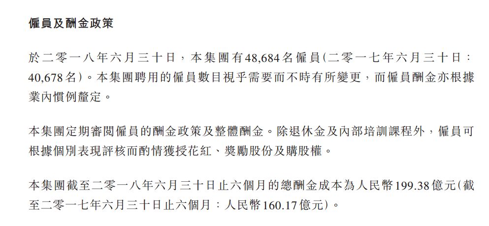 财报显示,腾讯现有48684名员工,会定期审核员工的薪酬制度及奖金。员工根据个人表现考核可获花红、股份奖励、购买股权。上半年,腾讯的薪酬支出约199.38亿元,比去年同期的160.17亿元上涨约30亿元。