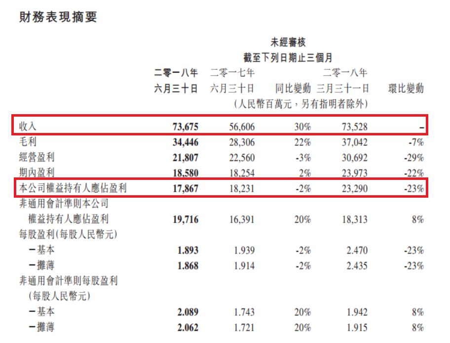 二季度实现营收736.75亿元,同比增长30%,环比基本持平;净利润178.67亿元,同比下降2%,环比大降23%。