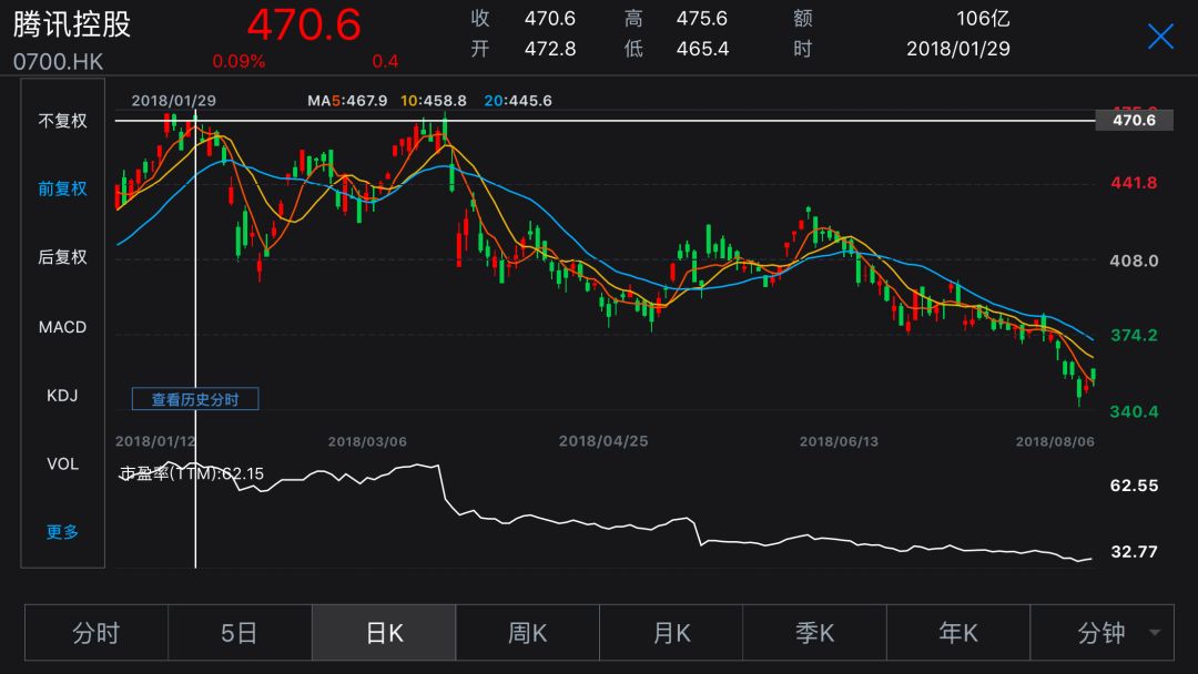 今年1月29日,腾讯创下475.6港元/股的新高价格,3月21日再次触及474.6港元/股。此后行情切换,开启下跌之路,直跌至目前的336港元/股,从最高点跌去约30%。