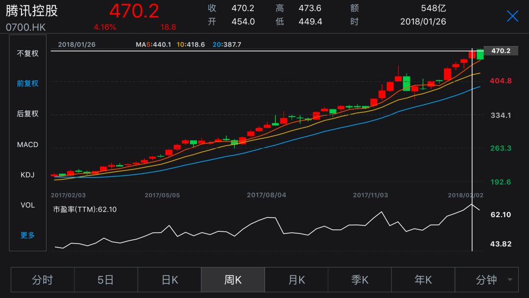 2017年一整年,腾讯走出持续上涨行情,从2016年底的180港元/股左右的价格,涨至今年年初的约450港元/股,翻了2.5倍。