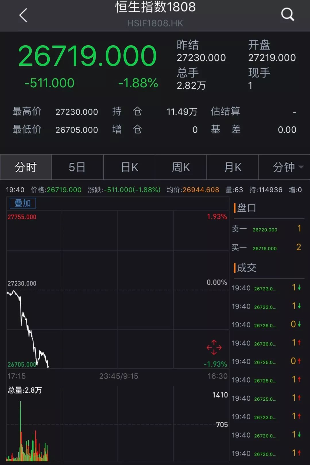 受腾讯财报不及预期影响,恒指期货短线跳水,一度跌1%下破27000点。