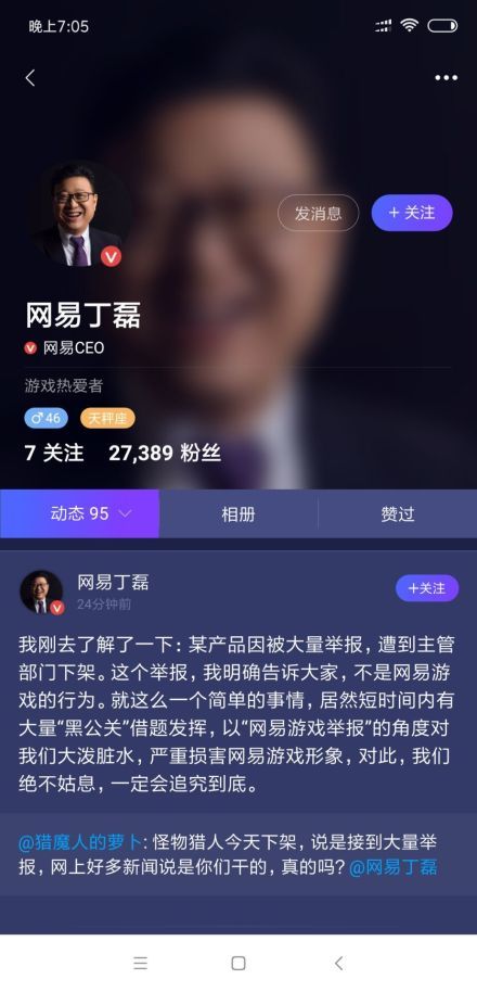 有网友认为举报者系腾讯竞争对手网易。网易CEO丁磊随后回复称,此举并非网易游戏所为,对于泼脏水的行为将追查到底。