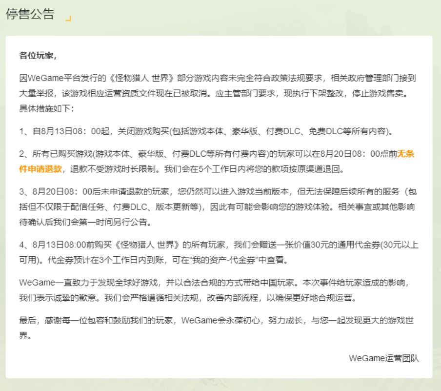 前两天,腾讯WeGame宣布其平台上的《怪物猎人世界》因“相关政府管理部门接到大量举报……现执行下架整改,停止游戏售卖”。所有已购买游戏的用户都可以申请全额退款。