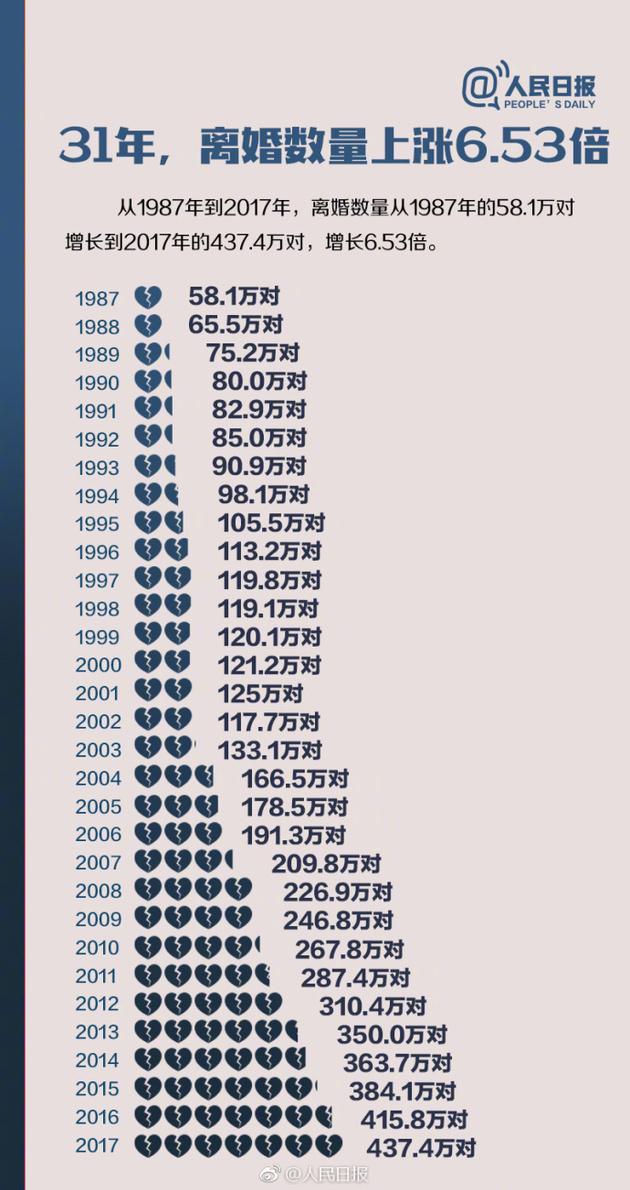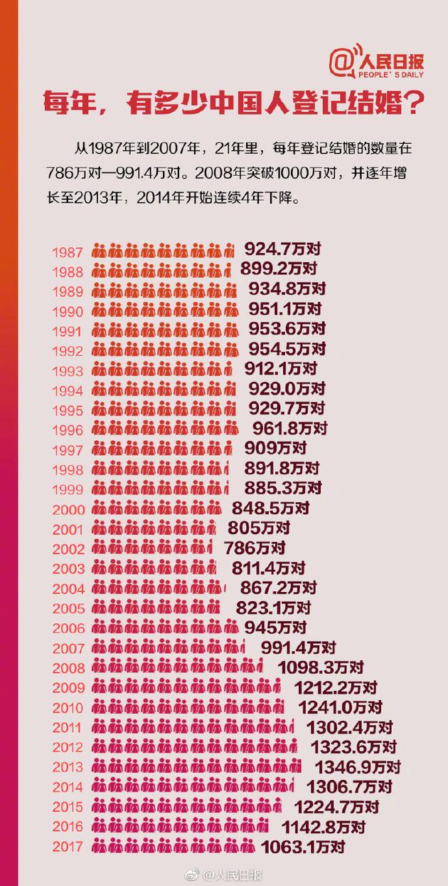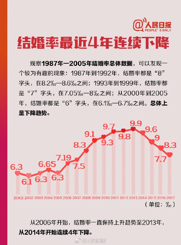 1987年到2017年,31年的民政部数据显示:“晚婚”现象明显,近5年25—29岁结婚登记的公民占最多。自2003年起,中国的离婚率逐年上升。每年,有多少中国人登记结婚?年轻人为什么晚结婚了?数据告诉你↓