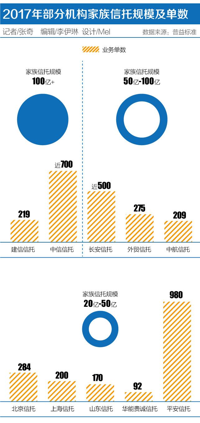 普益标准近日发布的一份报告显示,2017年末,有近30家信托公司开展家族信托业务,存量规模合计超500亿元,存量产品数近3000单。其中,建信信托、中信信托、外贸信托等公司规模居前。
