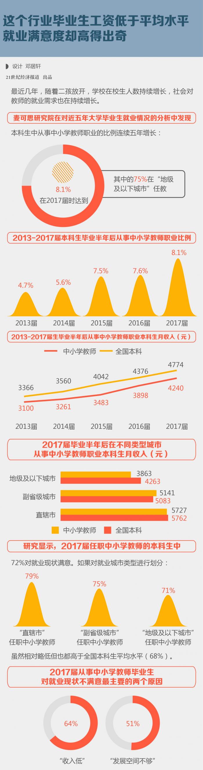 麦可思研究院在对近五年大学毕业生就业情况的分析中发现,本科生中从事中小学教师职业的比例连续五年增长,在2017届时达到8.1%,其中的75%在“地级及以下城市”任教。