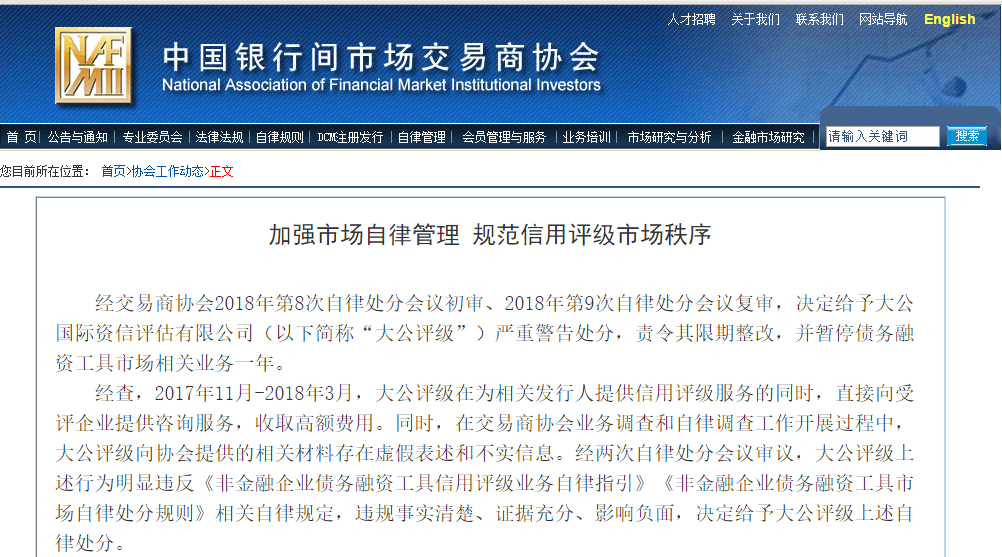 交易商协会还特别指出,在其进行业务调查和自律调查的过程中,大公评级向协会提供的相关材料存在虚假表述和不实信息。
