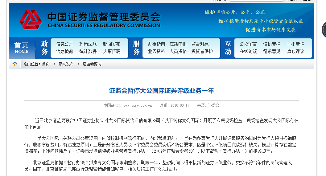 8月17日,证券评级行业传出重磅新闻,业内知名的评级机构公司大公国际资信评估有限公司(以下简称大公国际)接连被证监会和交易商协会做出严厉处罚。
