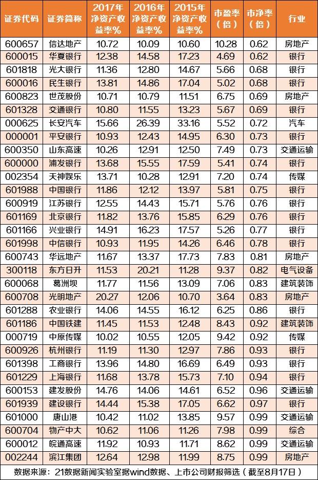 21数据新闻实验室从盈利能力、估值水平和稳健经营三方面出发,通过净利润、净资产收益率、市盈率等指标进行筛选。按照市场一般规律,给出如下条件: