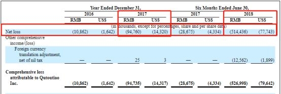 2017年调整后净亏损为9138万元人民币(合1380.9万美元),相比之下2016年调整后净亏损为1046.8万元人民币(合158万美元);截至2018年6月30日的前6个月,调整后净亏损为3.291亿元人民币(合4972.7万美元)。