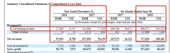 并在截至2018年6月30日为止的六个月时间里进一步增长到了7.178亿元人民币(合1.085亿美元),其中来自广告的收入为6.70亿元,占总收入的比重达到93.31%。