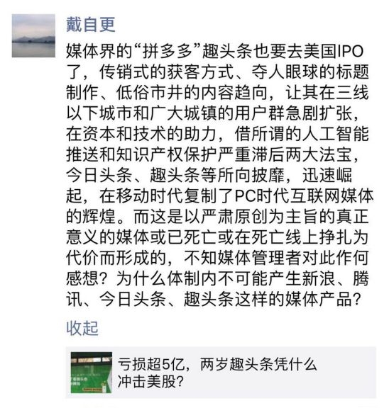 而这样的趣头条准备上市,前新京报社社长、现北京市文化投资发展集团总经理戴自更在朋友圈表达了自己的看法。他认为趣头条和今日头条类似,都是借所谓的人工智能推送和知识产权严重滞后两大法宝崛起。