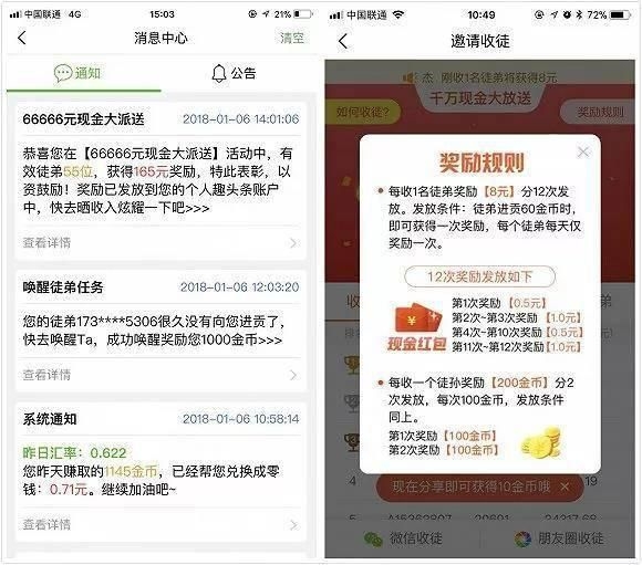 据了解,趣头条不仅有注册得金币、签到得金币、阅读新闻得金币、邀请朋友注册得金币(收徒)、分享新闻链接到朋友圈得金币等等,几乎涵盖了用户在APP上的所有行为。
