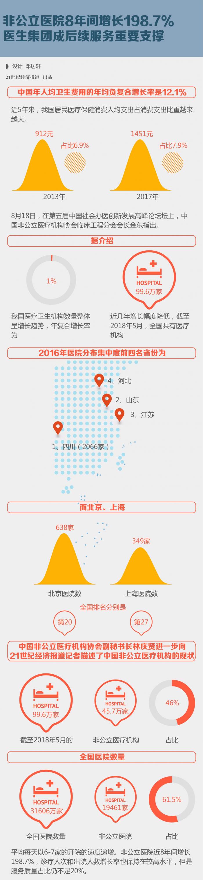 中国非公立医疗机构协会副秘书长林庆贤进一步向21世纪经济报道记者描述了中国非公立医疗机构的现状:截至2018年5月的99.6万家医疗机构中,非公立医疗机构45.7万家,占比46%;全国医院数量31606万家,非公立医院19461家,占比61.5%,平均每天以6-7家的开院的速度递增。非公立医院近8年间增长198.7%,诊疗人次和出院人数增长率也保持在较高水平,但是服务质量占比仍不足20%。