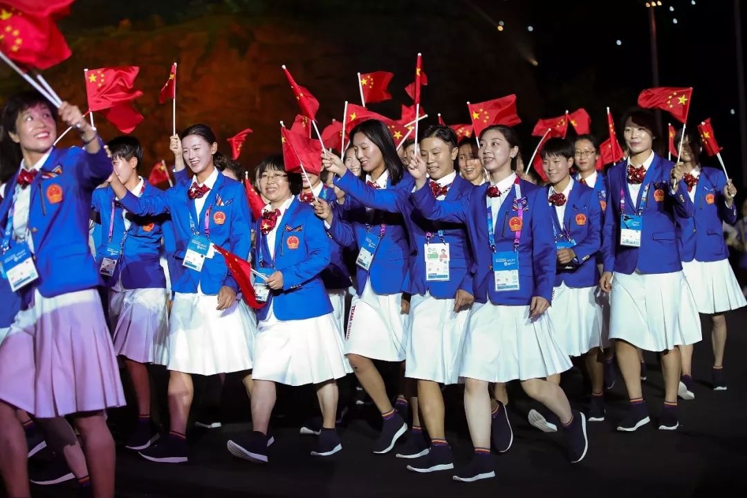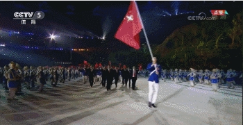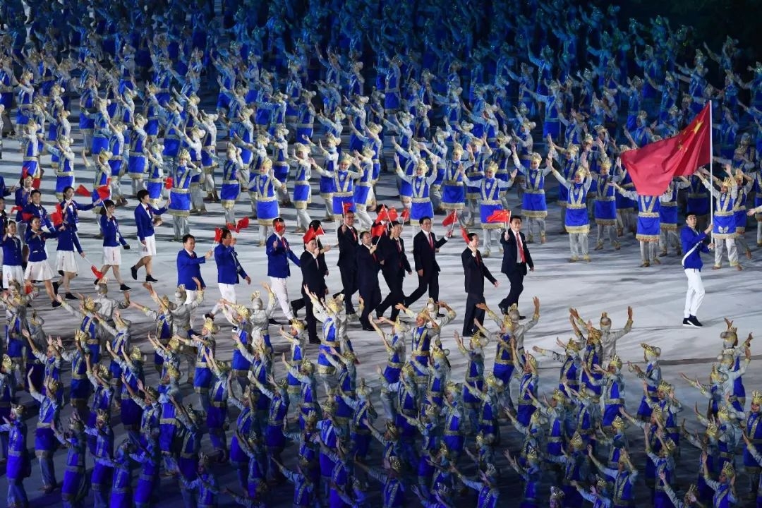 中国代表团由男子跆拳道运动员赵帅担任旗手,高举五星红旗进入体育场。