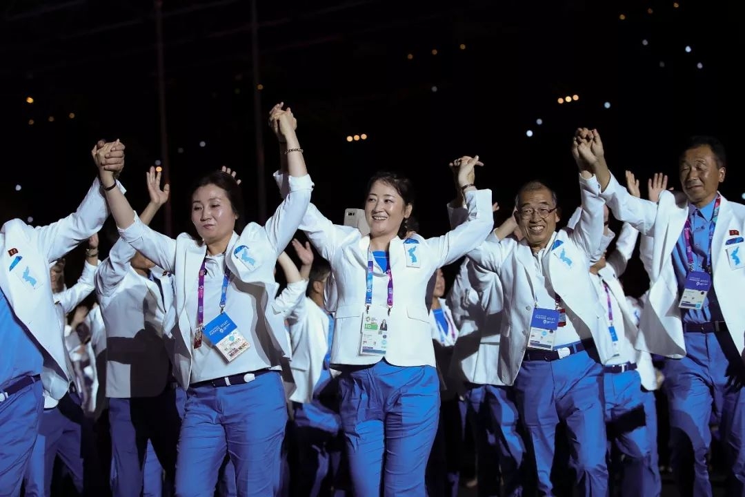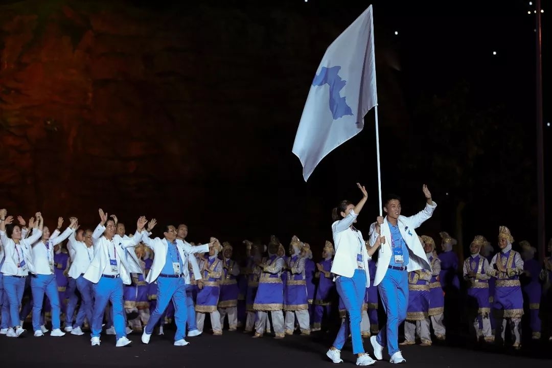 朝鲜和韩国再次组成联队,在半岛旗的引领下,两国运动员身着统一服装,在热烈的掌声中一起步入主会场。朝韩还将组建联队参加龙舟、赛艇和篮球三个项目的比赛。