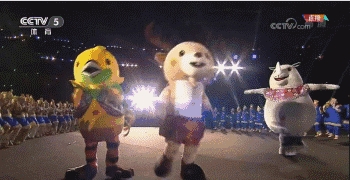 雅加达亚运会的吉祥物极乐鸟“Bhin Bhin”、独角犀牛“Ika”和巴岛花鹿“Atung”将入场仪式推向了高潮。