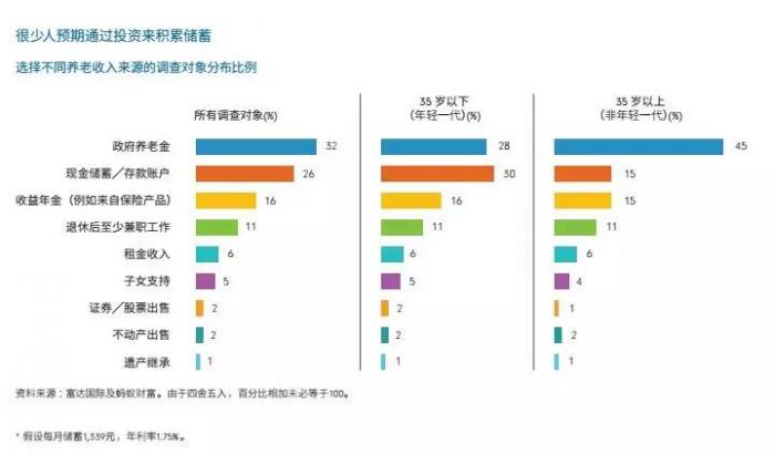 在所有调查对象中,32%的人认为养老收入来自于政府养老金,26%的人认为现金储蓄是养老收入的重要来源。此外,收益年金、退休后兼职工作、租金收入是部分人养老收入的来源。