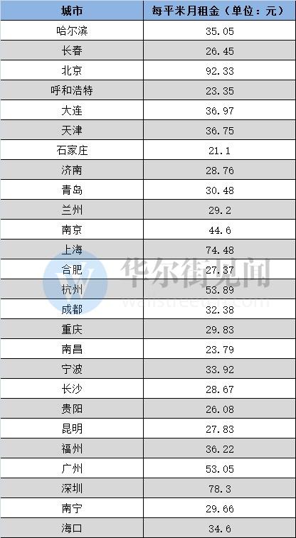 据中国房价行情网数据,在全国大中城市中2018年7月北京的月平均租金最高,为92.33元/月/㎡,深圳为78.3元/月/㎡、上海74.48元/月/㎡、杭州53.89元/月/㎡。而月平均租金最低的城市为石家庄,为21.1元/月/㎡。