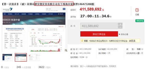 因珠海中富控股股东捷安德破产,其持有的1.46亿股珠海中富股票将于9月17日起拍,竞价周期24小时,起拍价为拍卖日前最后一个交易日股票收盘价乘以股票总股数,若以昨日3.05元/股的收盘价计算,起拍价约为4.47亿元。