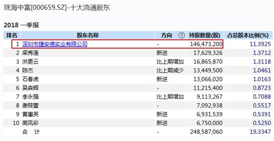 通知函显示,2018年8月1日,深圳中院宣告深圳市捷安德实业有限公司破产。经调查,捷安德为珠海中富控股股东,其开立的深市A股证券账户持有珠海中富无限售流通股146,473,200股。上述股票系捷安德唯一有效资产。