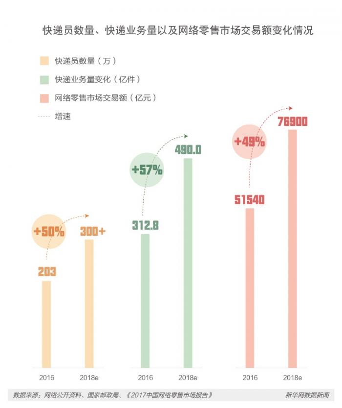 《2018快递员群体洞察报告》显示,从2016年至今,中国的快递员数量增长了50%,总数量已突破300万。我国快递业务量实现了57%的增长,预计2018年快递业务量将达到490亿件,网络零售市场规模超7万亿。