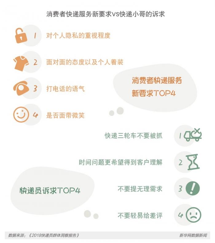 快、准时、及时响应、对隐私的重视程度、个人形象、礼貌成为快递小哥的服务获得好评的重要因素。快递小哥们也从内心里希望自己的三轮车不要被抓、时间问题更得到客户理解、不要提无理需求、也不要轻易给他们差评。