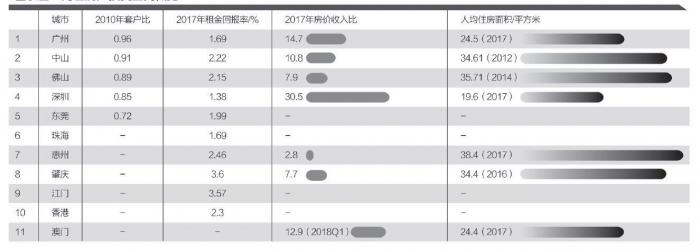从住宅租赁投资角度,当城市租金回报率达到4%或以上,在当地投资房地产才会获得相对可观的收益,综合大湾区内地11城数据来看,普遍较难达到这一水平。肇庆和江门的房地产投资能够获得相对合理的租金回报水平。一线城市则处于横向比较之下的相对低位。
