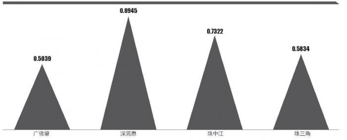深莞惠经济圈平均产业同构系数高达0.8945,产业同构现象最为严重,三市均以电子信息制造业为主。