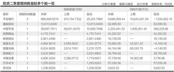 平安银行成为险资重点吸筹的对象。截至二季度末,平安集团、平安人寿和新华人寿合计持有平安银行约100亿股,平安集团在二季度还加仓平安银行2.5亿股,累计持有85.1万股,相比上期的82.6亿股,增持比例约为3.15%。