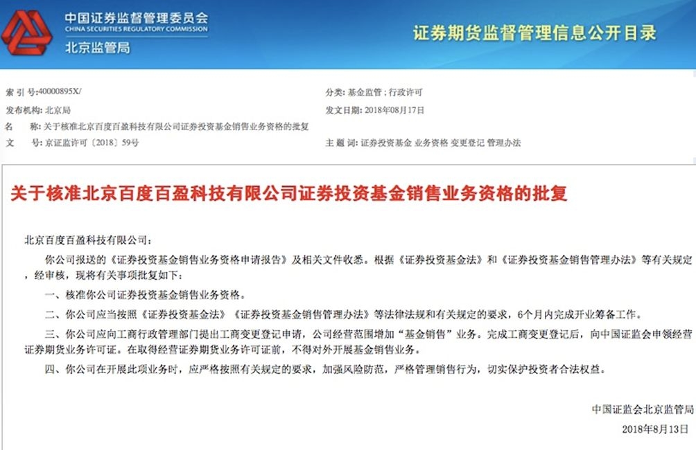 昨日晚间,北京证监局官网发布《关于核准北京百度百盈科技有限公司证券投资基金销售业务资格的批复》,核准百度百盈的基金销售业务资格。至此,第三方基金销售领域终于集齐BATJ等“互联网巨头”。