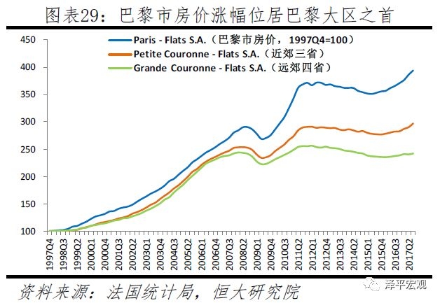巴黎市房价涨幅位居巴黎大区之首。由于巴黎市土地面积较小(105平方公里),稍大于北京市东城区和西城区面积之和(93平方公里),因此我们不再对巴黎市内部房价进行分析,而是将巴黎市作为巴黎大区的核心区域,分析其与巴黎大区其他区域房价的走势差异。根据法国统计局(INSEE)数据,1997年4季度至2017年3季度,巴黎市房价涨幅达2.95倍,明显超过近郊三省的1.97倍、远郊四省的1.43倍、法国平均的1.38倍,以及该时期法国名义GDP涨幅(0.8倍)。近郊三省Hauts de Seine、Seine St Denis、Val de Marne房价涨幅分别为2.03、1.91、1.88倍。远郊四省Yvelines、Val d'Oise、Seineand Marne、Essonne房价涨幅分别为1.51、1.50、1.35、1.25倍。