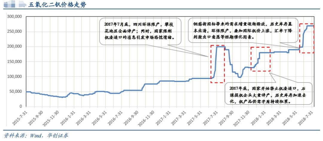 据华创证券研报,截至2018年8月初,钒价(以五氧化二钒计)由2016年1月4日的3.5万元/吨持续攀升至当前的27万元/吨,涨幅高达671%。即便以2017年6月30日的9.4万元/吨的价格计算,至今的涨幅也高达187%。华创证券认为,综合钒的供需基本面和下游对价格的敏感程度,后市五氧化二钒价格将稳重偏强,至少保持在27万元/吨的水平上。