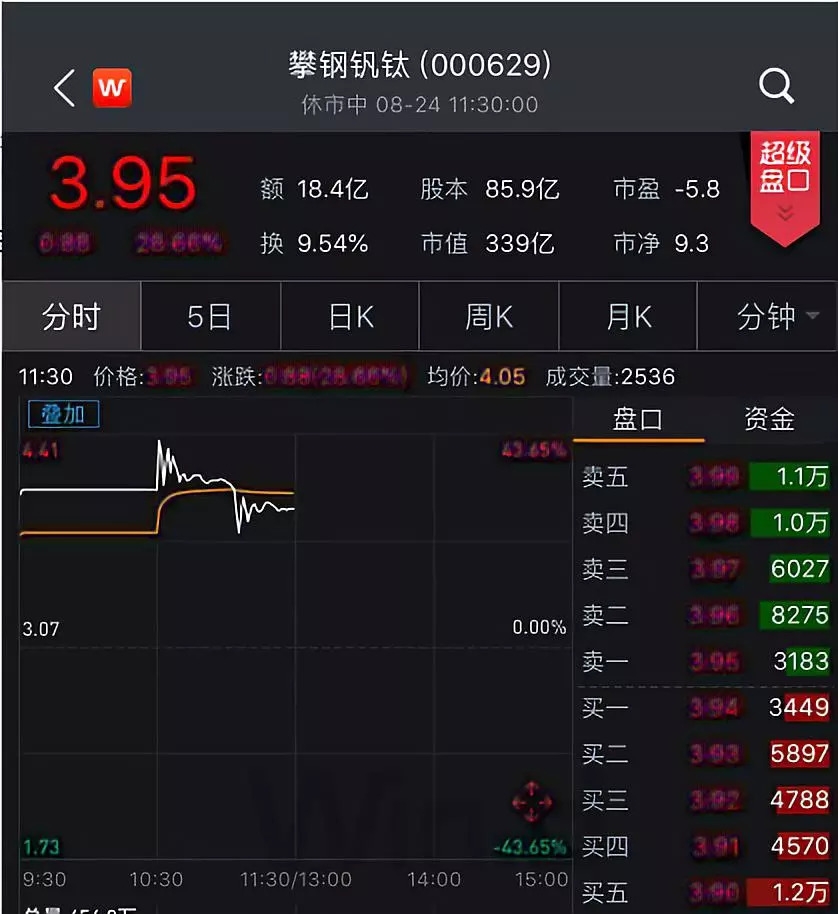 8月24日,*ST钒钛(000629,SH)重回A股,股票简称也变更为攀钢钒钛,恢复上市首日不设涨跌幅限制。该股高开两成,开盘后快速拉升涨幅32.57%后被临时停牌1个小时,复牌后一度大涨超40%后回落,截至午间收盘,报3.95元/股,上涨28.66%。(21小编注,截至今日收盘,报3.84元/股,上涨25.08%。)