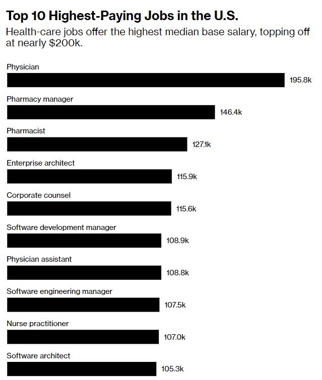 排名前三的分别是医生、药店经理和药剂师,其平均年薪分别为195842美元、146412美元和127120美元。