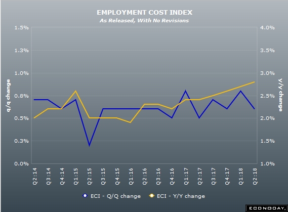 美国劳工部7月31日公布,二季度ECI(企业雇佣成本指数)同比增2.8%,环比0.6%,略低于预期值0.7%。该成本中占70%的员工薪资花费同比增2.8%,环比增0.5%。两项指标同比增速均达到2008年9月以来的最高水平。